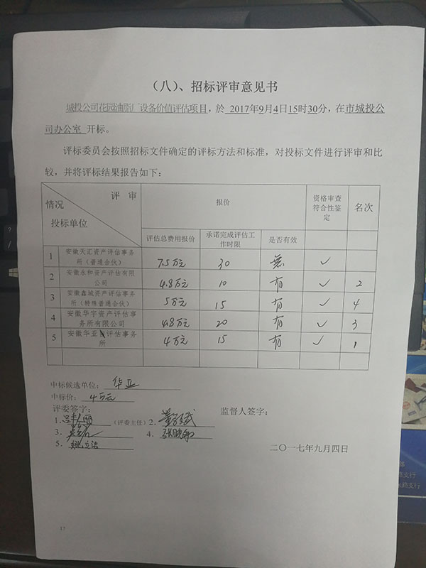 中標候選人:安徽華亞評估事務所(中標價格:4萬元,承諾完成評估工作時限:15個工作日)
