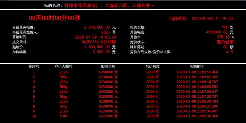 2020年1月9日在市公共資源交易平臺(tái)開展了網(wǎng)絡(luò)競價(jià),我公司的花園油脂廠廠房及建筑物拆除權(quán)項(xiàng)目,公告期內(nèi)共征集到19家符合要求的競買人,最終經(jīng)過791輪的競爭出價(jià),該項(xiàng)目以624萬元成交,較評(píng)估值增值459萬元,增值率達(dá)278.2%。
