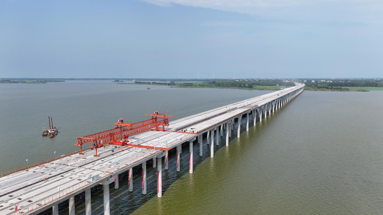 此次貫通的沱湖特大橋是蚌埠城投五蒙高速公路項(xiàng)目重要控制性工程,也是全線最長的橋梁,由中交第二航務(wù)局承建。大橋西起申集鎮(zhèn)彭集村,向東跨越沱湖至雙忠廟鎮(zhèn)阮圩村。橋面主體全長3153米,寬27米,為雙向四車道,跨越省級自然保護(hù)區(qū)沱湖,具有環(huán)保要求高,施工難度大等特點(diǎn)。